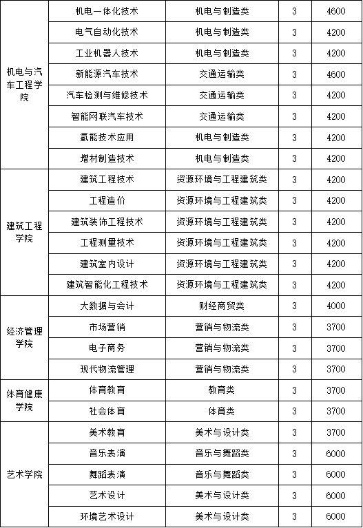 根据《河南省发展和改革委员会 河南省财政厅 河南省教育厅关于调整公办普通高校学费标准的通知》(豫发改收费[2020]456号)的文件精神,制定收费标准。其中,学费标准:文史类专业中智慧健康养老服务与管理、大数据与会计学费为4000元/生·年,其余专业学费为3700元/生·年;理工类专业中计算机应用技术、机电一体化技术、新能源汽车技术学费为4600元/生·年,其余专业学费为4200元/生·年;艺术类专业学费6000元/生·年。住宿费标准:6人间700元/生·年,4人间800元/生·年。