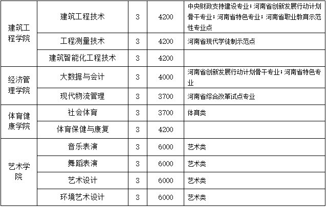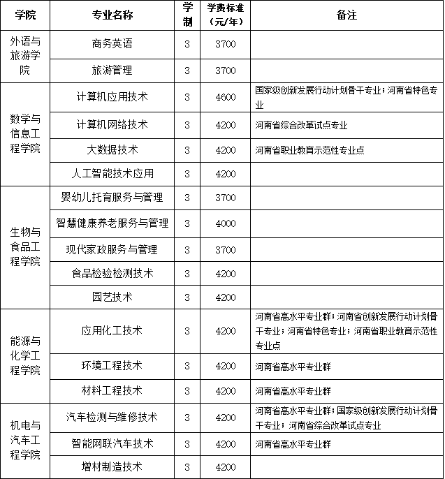 根据《河南省发展和改革委员会 河南省财政厅 河南省教育厅关于调整公办普通高校学费标准的通知》(豫发改收费[2020]456号)的文件精神,制定收费标准。其中,学费标准:文史类专业中智慧健康养老服务与管理、大数据与会计学费为4000元/生·年,其余专业学费为3700元/生·年;理工类专业中计算机应用技术学费为4600元/生·年,其余专业学费为4200元/生·年;艺术类专业学费6000元/生·年。住宿费标准:6人间700元/生·年,4人间800元/生·年。